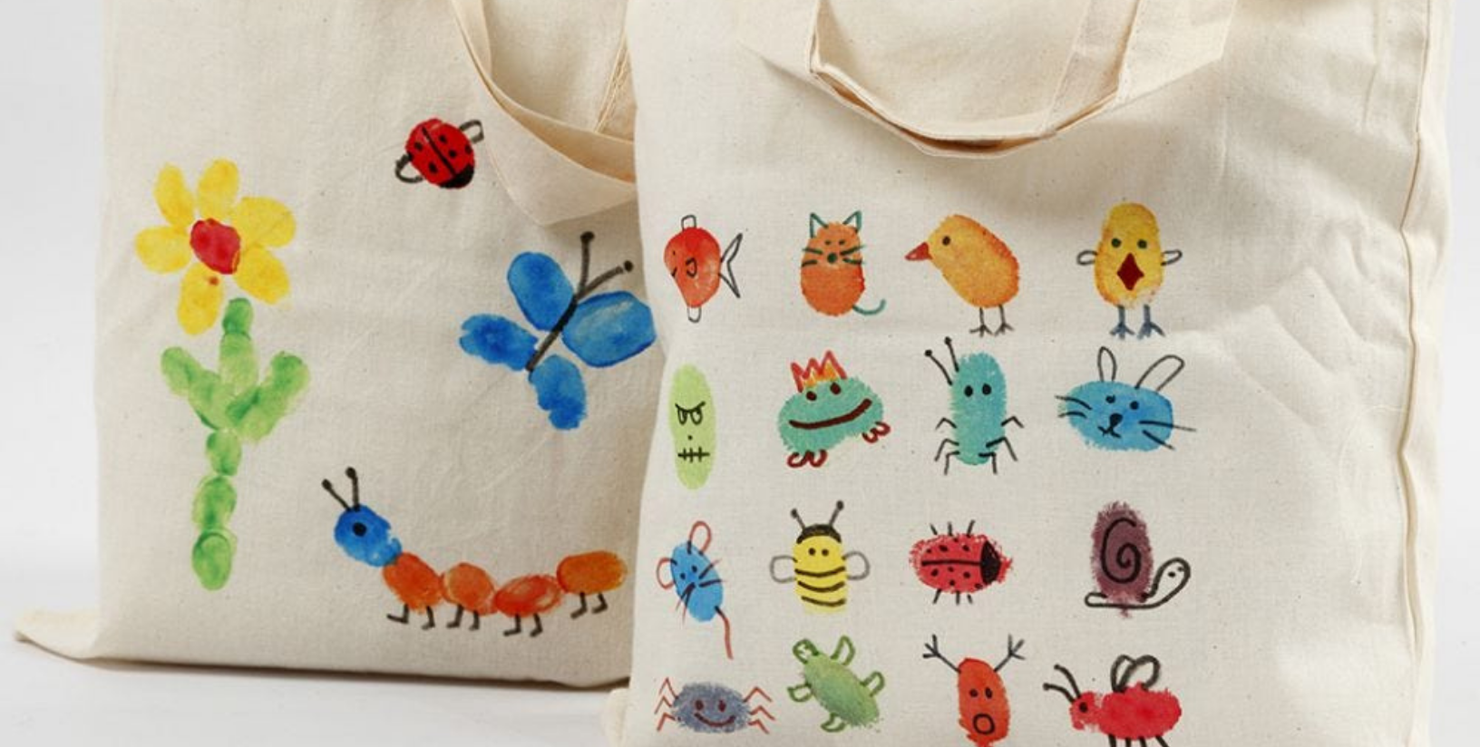 Decoreer een boodschappentas met vingerverf voor textiel. De figuurtjes zijn gemaakt van duimafdrukken. Met textielstiften kun je extra details aan brengen.