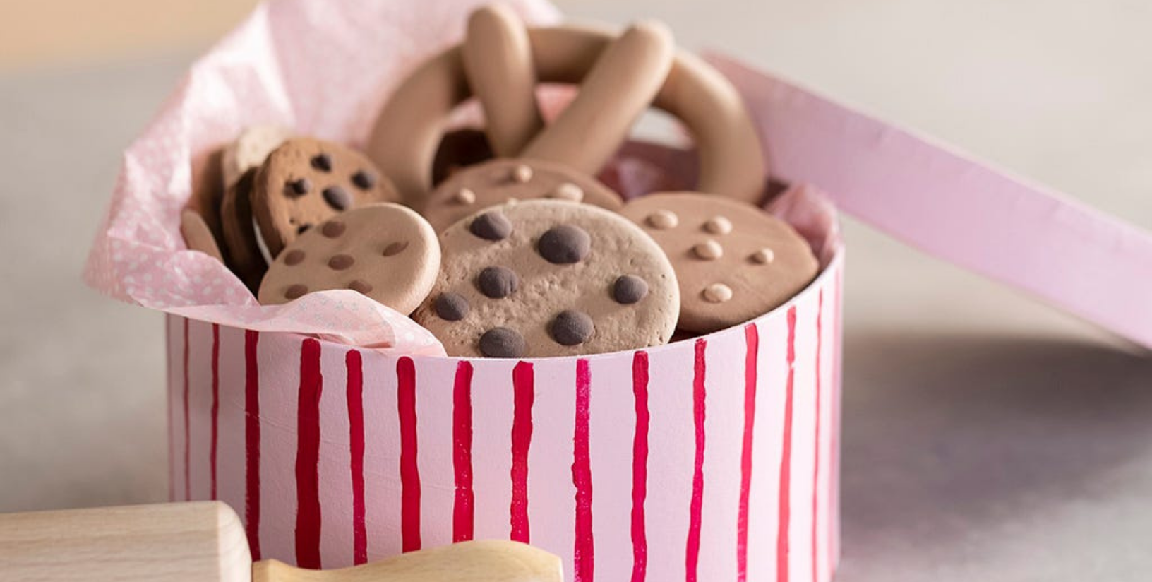 Maak koekjes, pretzels en kaakjes van Silk Clay. Gebruik deze aan de lucht drogende boetseerklei voor koekjes. Na het maken van de koekjes zijn ze leuk te gebruiken voor de speelkeuken van de kleintjes.
