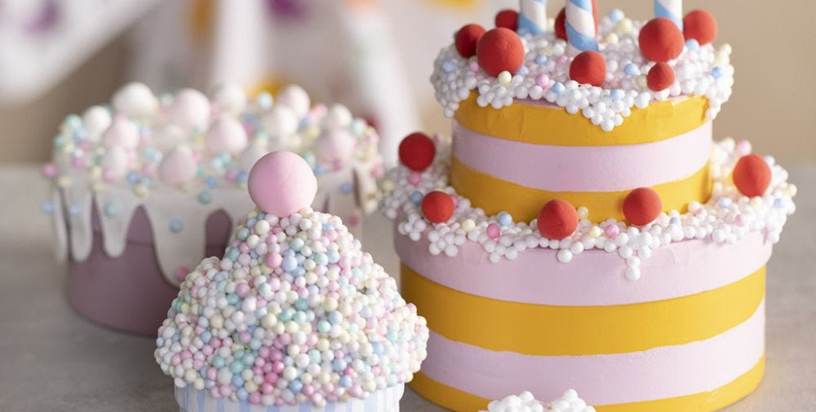 Maak verschillende lekkernijen met dozen en foam clay. Versier de dozen op een vrolijke en creatieve manier, totdat ze eruit zien als echt cupcakes en taarten. Laat de foam clay goed drogen. Gebruik de dozen na het knutselen als leuke opbergplek!