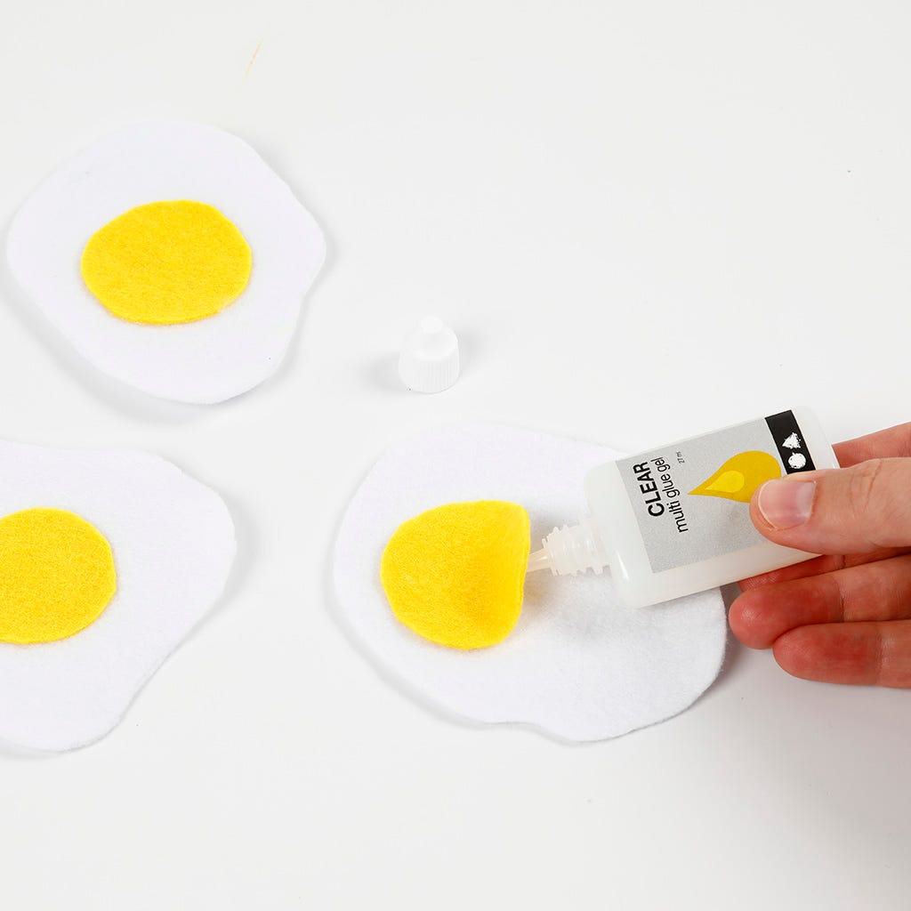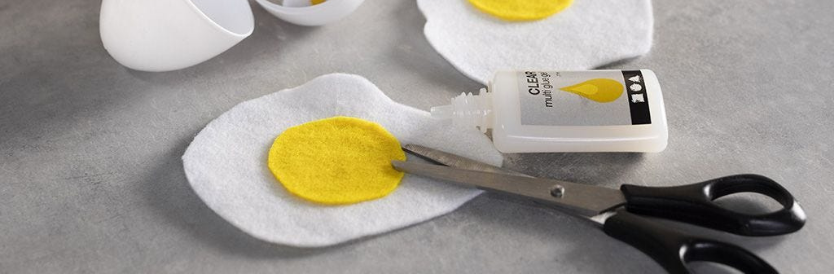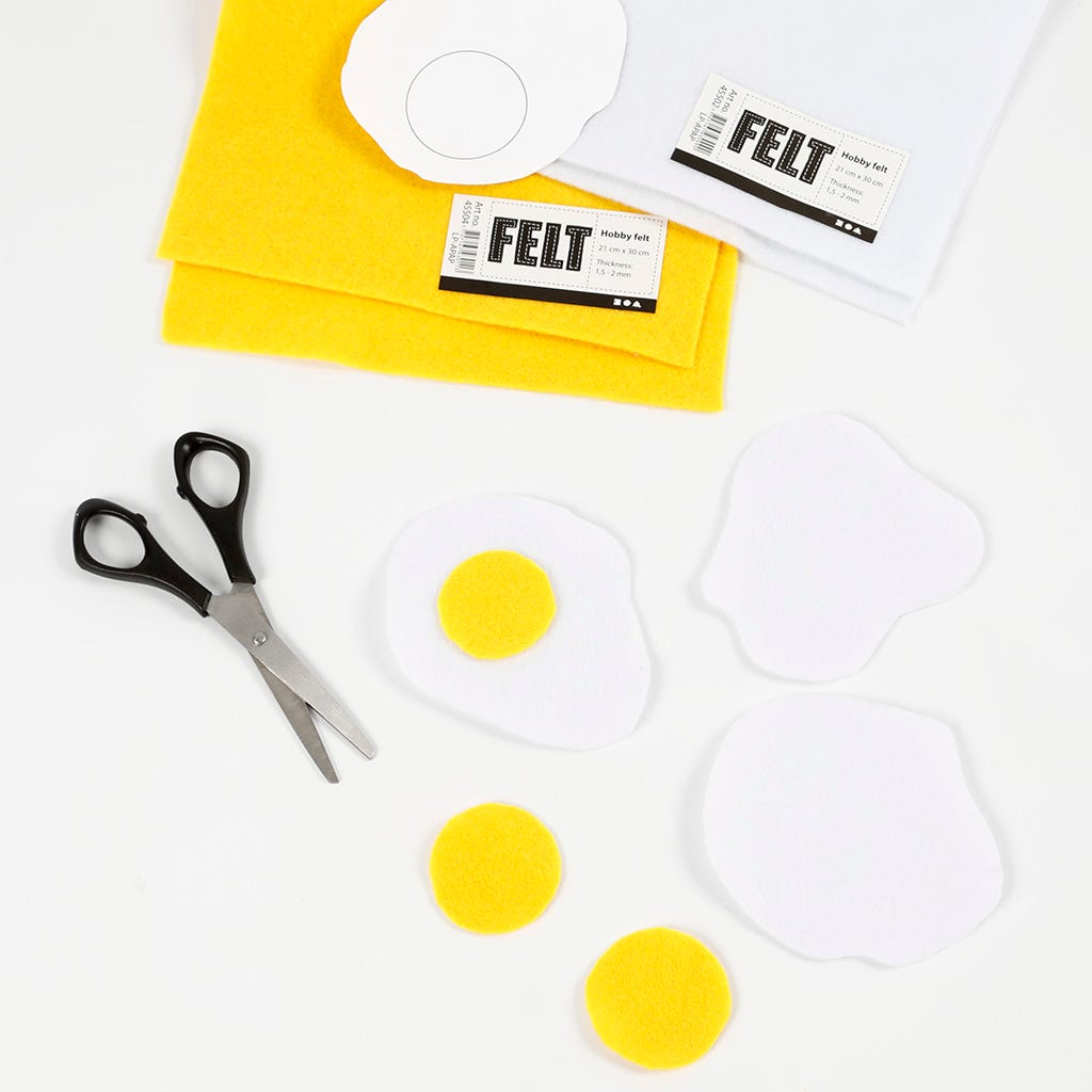 Knip gebakken eieren uit het witte vilt. Maak de eieren in verschillende vorm, een gebakken ei zit er namelijk nooit hetzelfde uit. Knip cirkels uit het gele vilt voor het eigeel.