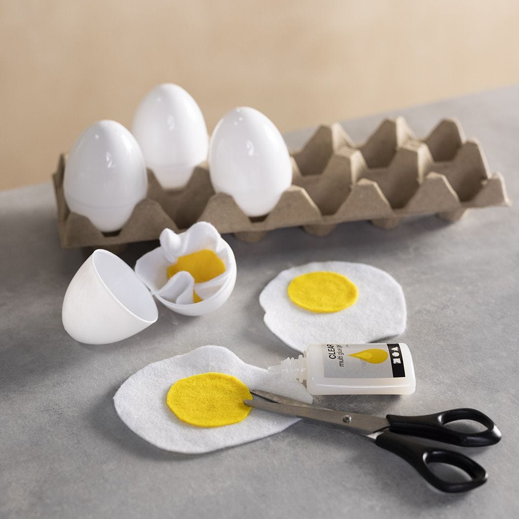 Een leuk knutselidee voor Pasen nodig? Heb dubbel plezier met deze eieren in een plastic eierschaal. Knutsel ze eerst in elkaar en breek ze daarna open in een pan voor een gebakken eitje.