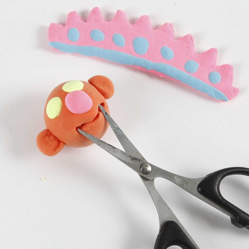 Vorm een stuk silk clay tot een hoofd met ogen, oren en een neus. Gebruik een schaar om een mond in de silk clay te maken. Versier het hoofd met een kroon en tanden.