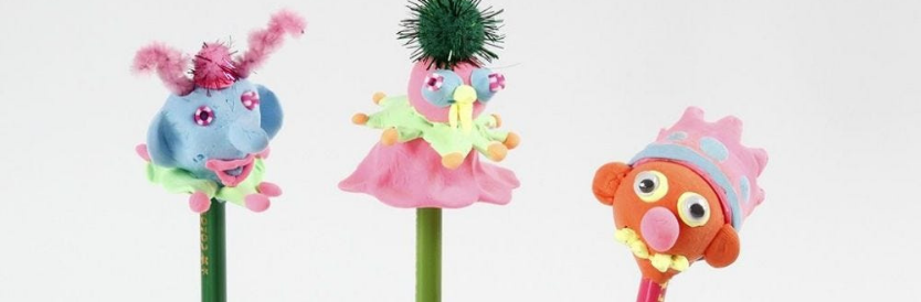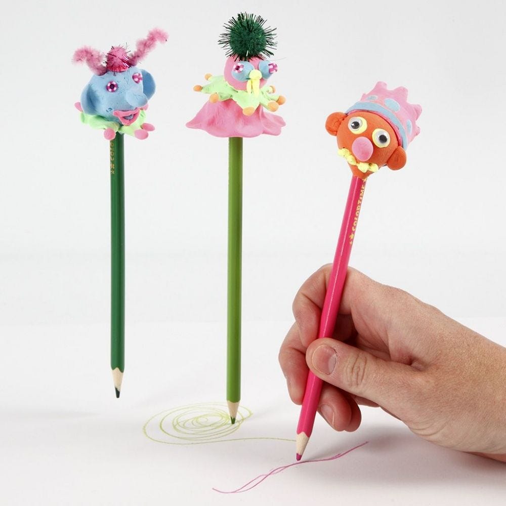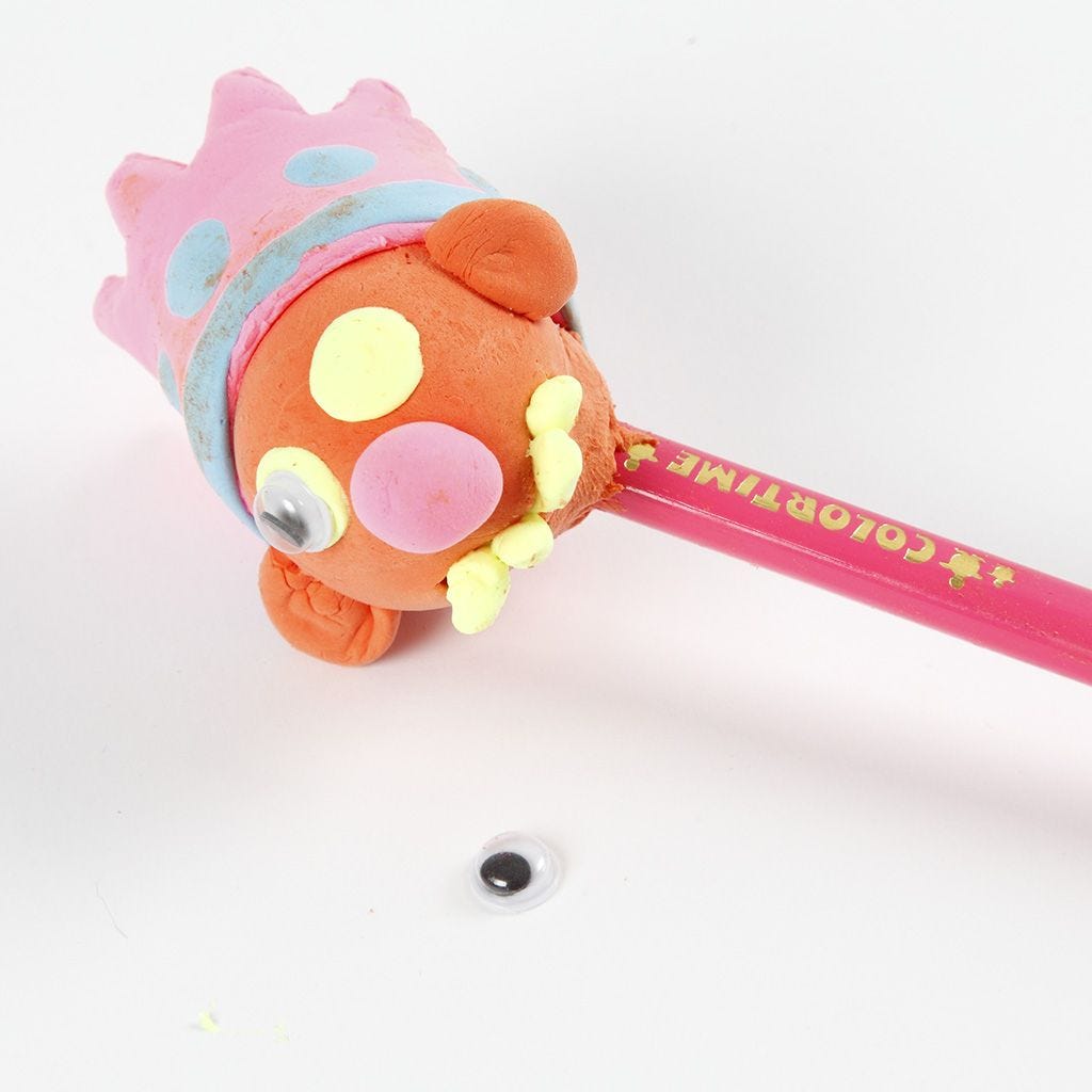 Maak het potloodmonstertje af met twee wiebeloogjes en duw het hoofd op het potlood.