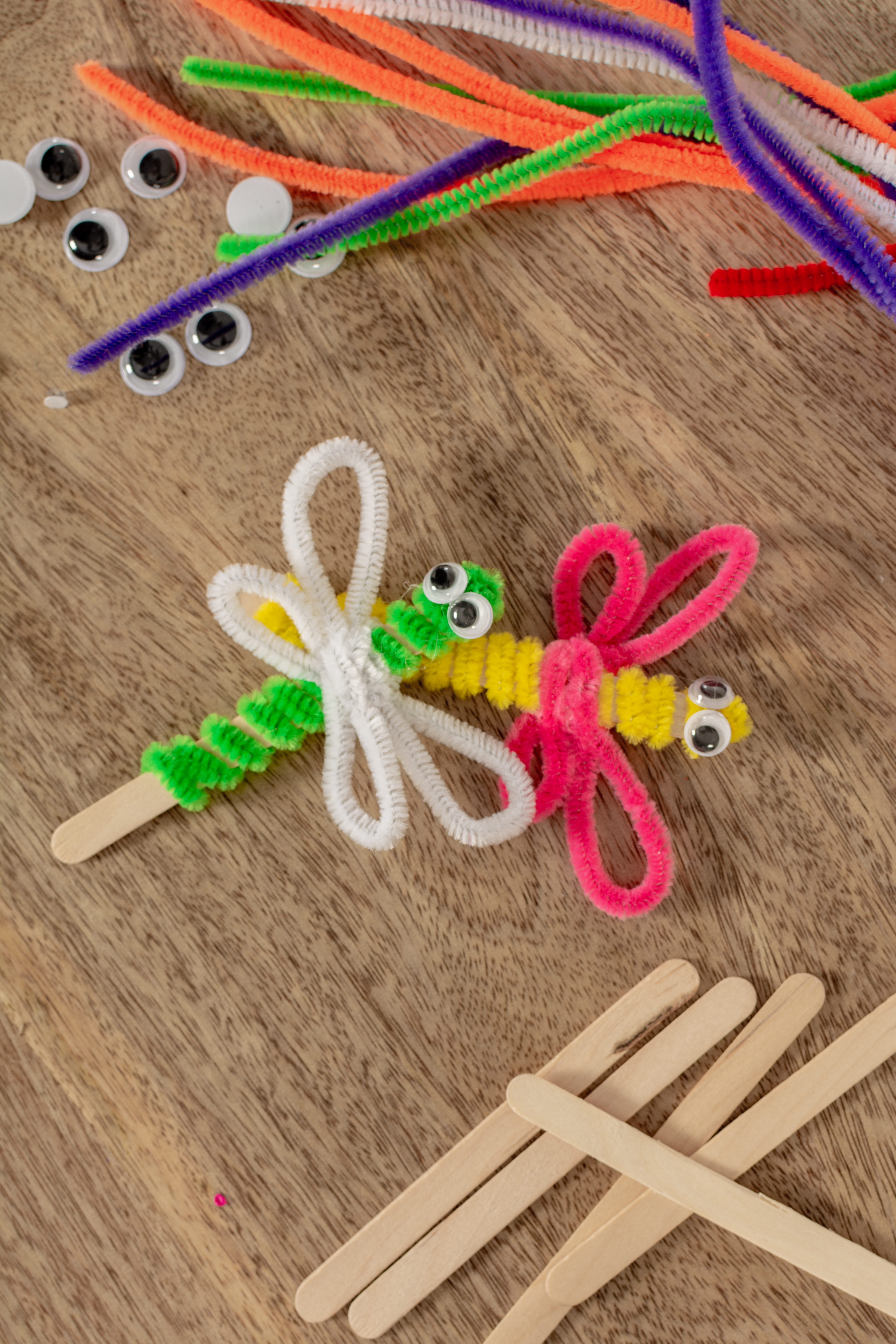 • Vorm de vleugels door het chenilledraad om het ijslollystokje te wikkelen.