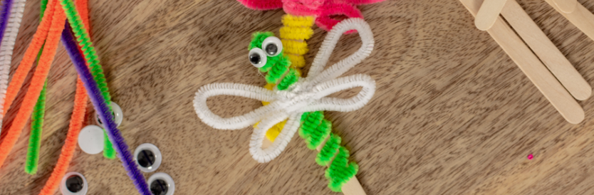 • Wikkel een lang stuk chenilledraad eenmaal om het ijslollystokje heen voor de vleugels van de vlinder.