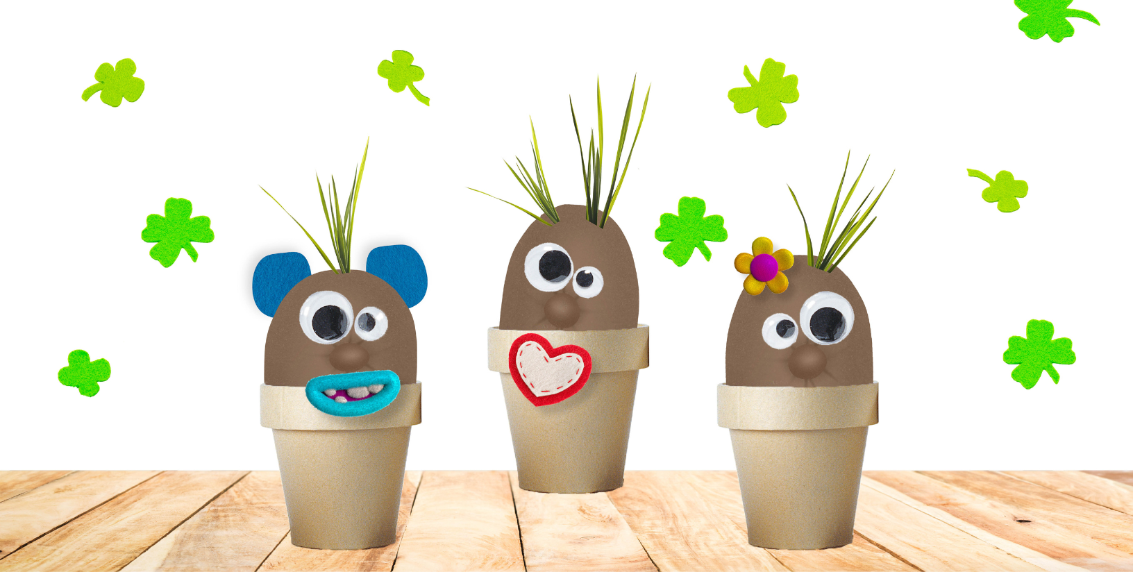 Als je deze zelfgemaakte poppetjes genoeg water geeft en goed voor ze zorgt, groeien bloemen als haren uit zijn hoofd.