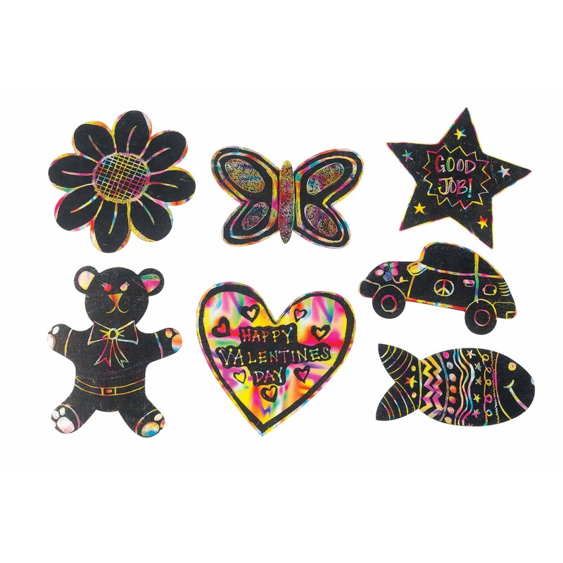 Krasfolie set met 7 vormen, vlinder, auto, vis, bloem, hart, ster en beer. Samen 98 stuks. Door de zwarte, niet giftige laag weg te krassen ontstaan leuke heldere kleuren.