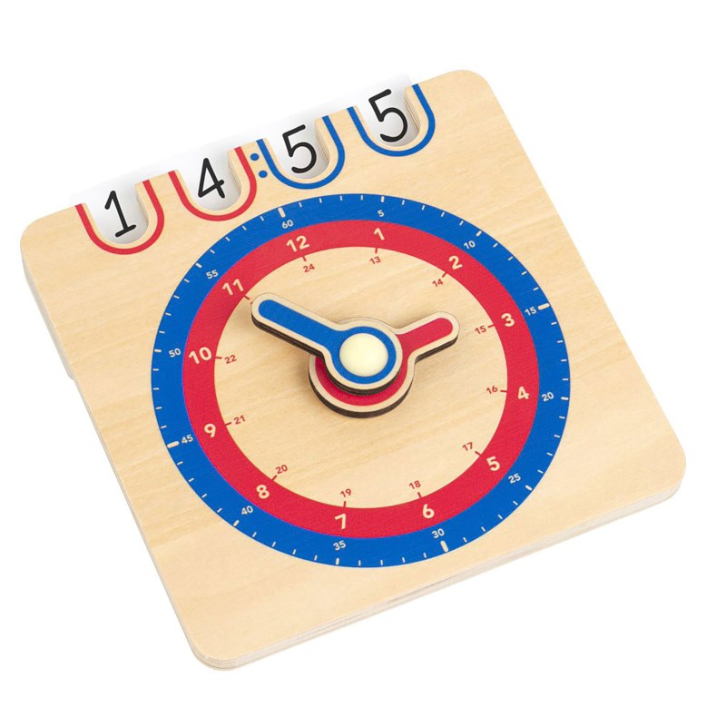 Oefenklok met 24-uurs analoge aanduiding en digitale tijdsweergave.