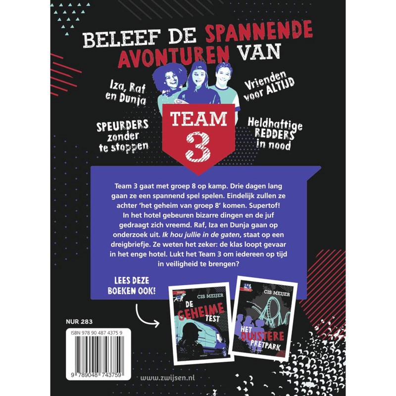 Team 3 gaat met groep 8 op kamp. Drie dagen lang gaan ze een spannend spel spelen. Eindelijk zullen ze achter 'het geheim van groep 8' komen. Supertof! In het hotel gebeuren bizarre dingen en de juf gedraagt zich vreemd. Raf, Iza en Dunja gaan op onderzoek uit. Ik hou jullie in de gaten, staat op een dreigbriefje. Ze weten het zeker: de klas loopt gevaar in het enge hotel. Lukt het Team 3 om iedereen op tijd in veiligheid te brengen?