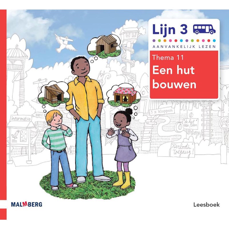 Leesboek bij thema 11 van Lijn 3 Een hut bouwen. Elk kind leest bij Lijn 3 in een eigen leesboek met een unieke dubbele leeslijn. Iedereen leest hetzelfde verhaal uit hetzelfde boek, maar wel op zijn eigen leesniveau. In de gekleurde achtergrond staat telkens de tekst op het moeilijkere niveau voor de goede lezer. In elk leesboek staan enkele samenleesverhalen. Daarbij wisselt het leesniveau binnen het verhaal en kan je samen met je kind afstemmen wie welke rol neemt.