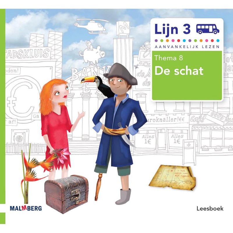 Leesboek bij thema 8 van Lijn 3 De schat. Elk kind leest bij Lijn 3 in een eigen leesboek met een unieke dubbele leeslijn. Iedereen leest hetzelfde verhaal uit hetzelfde boek, maar wel op zijn eigen leesniveau. In de gekleurde achtergrond staat telkens de tekst op het moeilijkere niveau voor de goede lezer. In elk leesboek staan enkele samenleesverhalen. Daarbij wisselt het leesniveau binnen het verhaal en kan je samen met je kind afstemmen wie welke rol neemt.