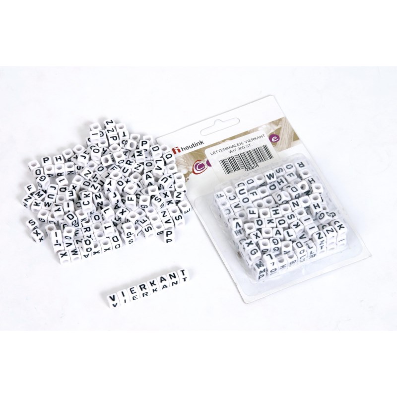 Vierkante, witte kunststofkralen met letters. Door het extra grote gat is het makkelijk rijgen. Er zitten ca. 200 kralen in het zakje. Leuk om een armbandje of ketting te rijgen met bijvoorbeeld elastisch draad. Je kunt deze letters ook gebruiken je eigen sleutelhanger te maken.