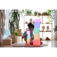 Gebruik de blokken eenvoudig als sfeerverlichting om een rustgevende ruimte te creëren of tijdens sensorische speelactiviteiten om de zelfregulatievaardigheden te bevorderen. De blokken bevorderen zelfs de taalontwikkeling van jonge kinderen, inclusief de voorzetsels, kleuren, tellen en reeksen. Ook de woordenschat wordt spelenderwijs gestimuleerd. Zie wat er gebeurt als je dunne sjaals over de blokken drapeert. En hoe verandert het licht als je het naast een helder raam neer zet?