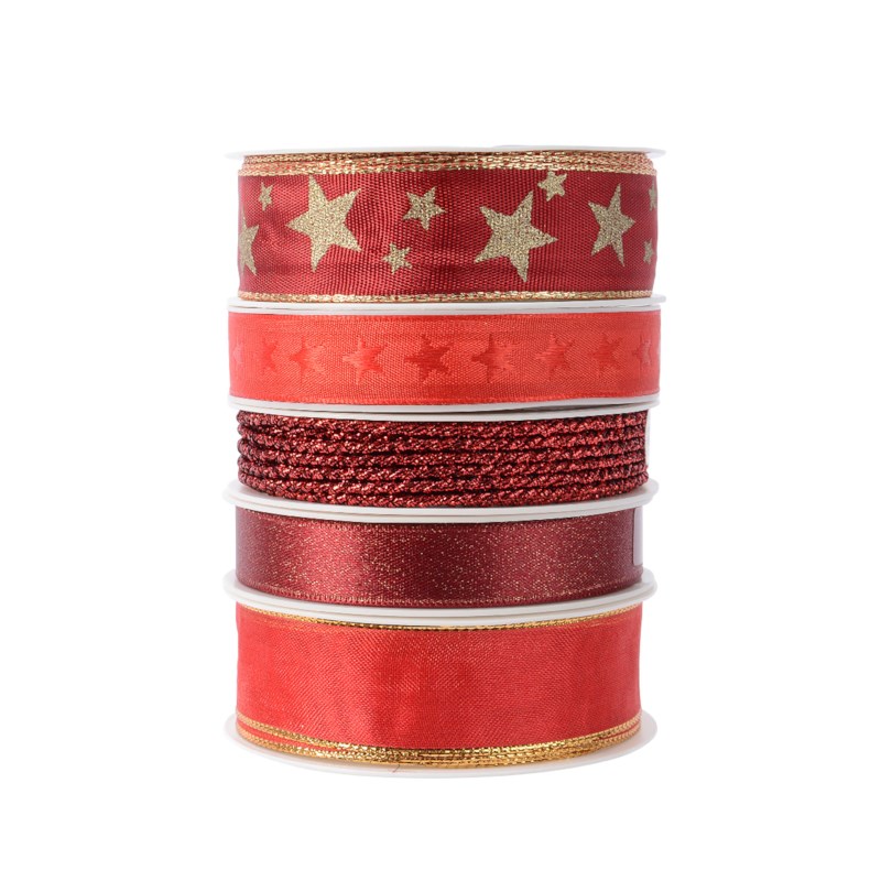 Polyester lint doosje met 5 rolletjes rood lint wat gebruikt kan worden bij het maken van kerstversieringen, maar ook als decoratie bij andere creatieve werkjes.