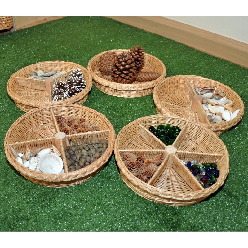 Een set van 5 manden met elk een andere indeling. Om spullen op te bergen of te sorteren.