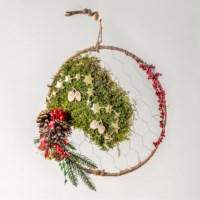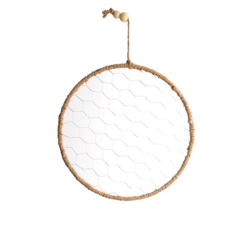 Metalen ring omwikkeld met touw en bedekt met gaas, handig om de hele ring te kunnen versieren.