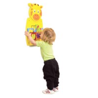 Een houten motoriekbord in de vorm van een giraf voor aan de wand.