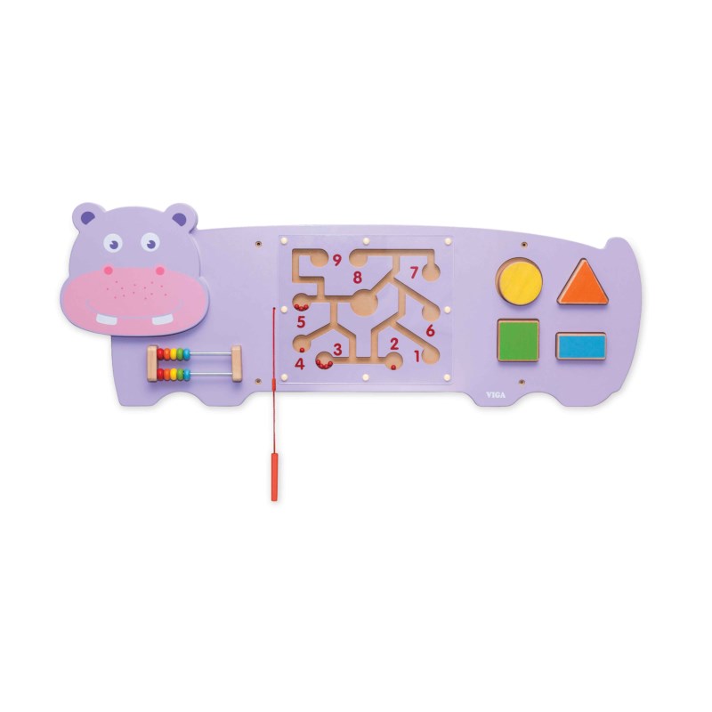 Een houten motoriekbord in de vorm van een nijlpaard voor aan de wand.