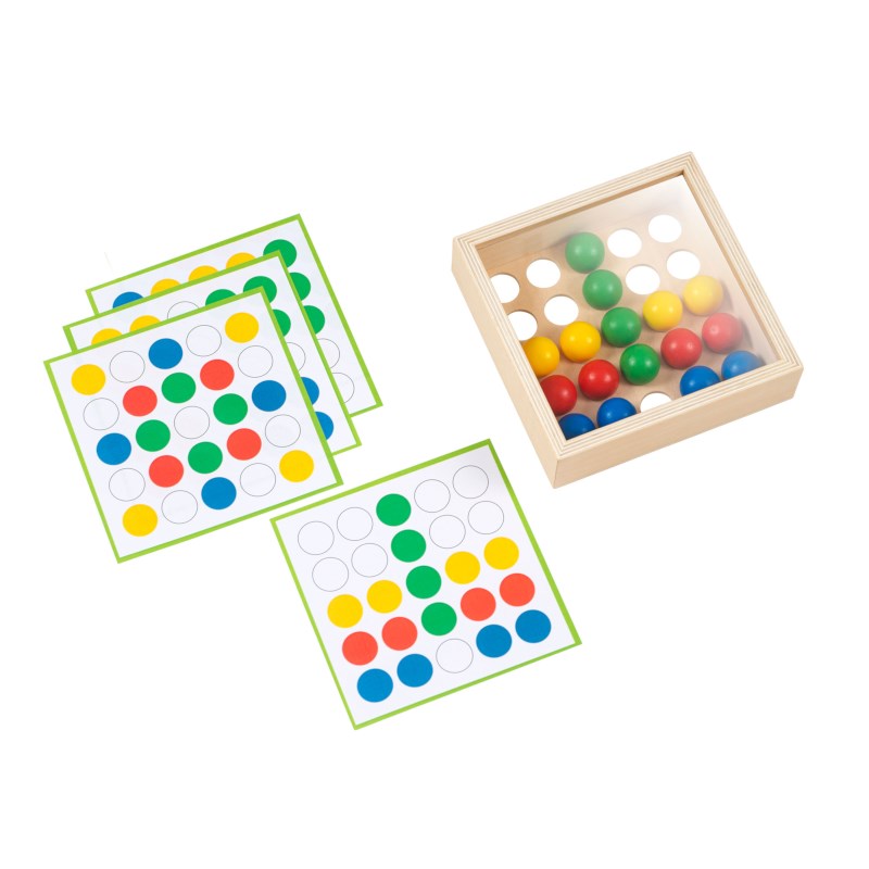 Mega Mozaïek - ballenbakje combineert beweging met motorische controle. Kinderen verplaatsen de gekleurde ballen met hun vingers, sturen ze door het ballenbakje en maken patronen na. Dit vraagt om
