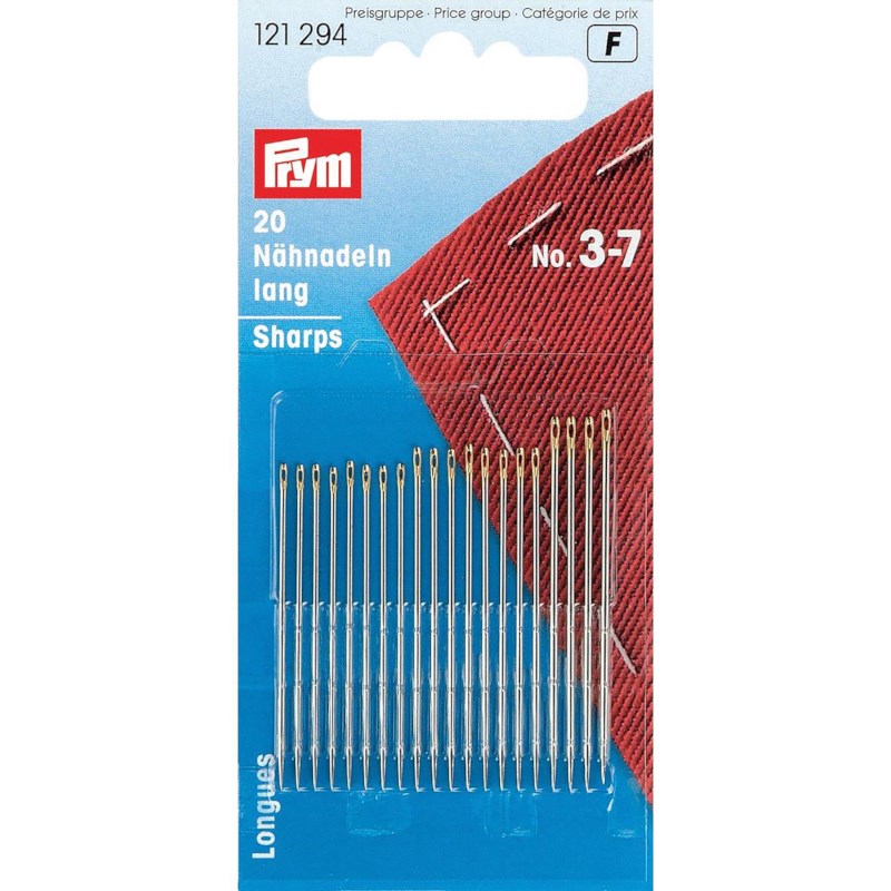 Naainaalden lang nr 3-7. Lang met goudkleurig oog. Totaal 20 naalden in de volgende maten: