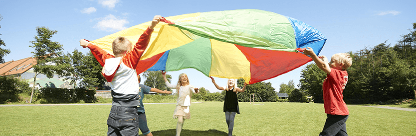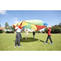 Om zelf uit een vliegtuig te springen, daarvoor zijn kinderen in de basisschoolleeftijd toch echt nog te jong. Maar ze zijn nooit te jong om met een parachute te spelen. Die kun je zelf maken van een (stoffen) zakdoek en vier koortjes. Bind de koortjes aan de hoeken van de zakdoek, knoop er een steentje of takje (of nog leuker: een Playmobil-poppetje) aan en klaar is de parachute.