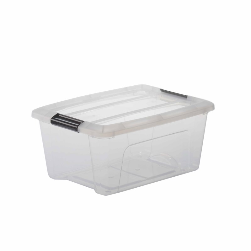 Transparante opbergbox met zwarte handgrepen.