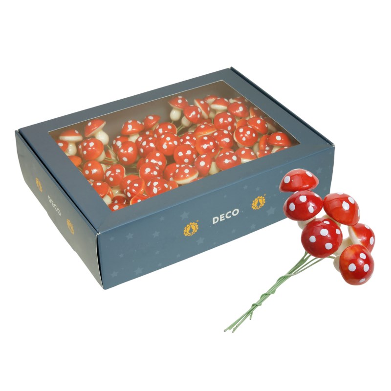 Decoratieve paddenstoeltjes die gebruikt kunnen worden voor het maken van kransen, herfsttaferelen en kerststukjes. De paddenstoeltjes zijn voorzien van een groen buigzaam stukje draad, zo kun je eenvoudig de paddenstoeltjes ergens in prikken of bevestigen.