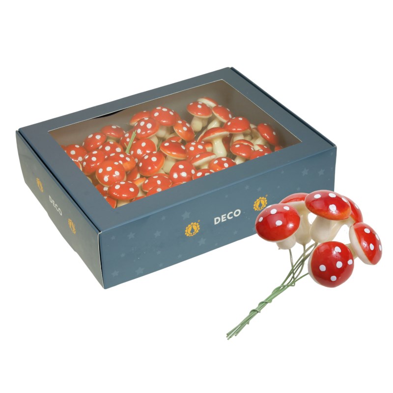 Decoratieve paddenstoeltjes die gebruikt kunnen worden voor het maken van kransen, herfsttaferelen en kerststukjes. De paddenstoeltjes zijn voorzien van een groen buigzaam stukje draad, zo kun je eenvoudig de paddenstoeltjes ergens in prikken of bevestigen.