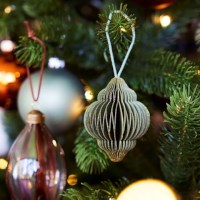 Een harmonica gevouwen papieren kersthanger in de vorm van een uivormige bal, erg leuk om een kerstsfeer mee te maken.