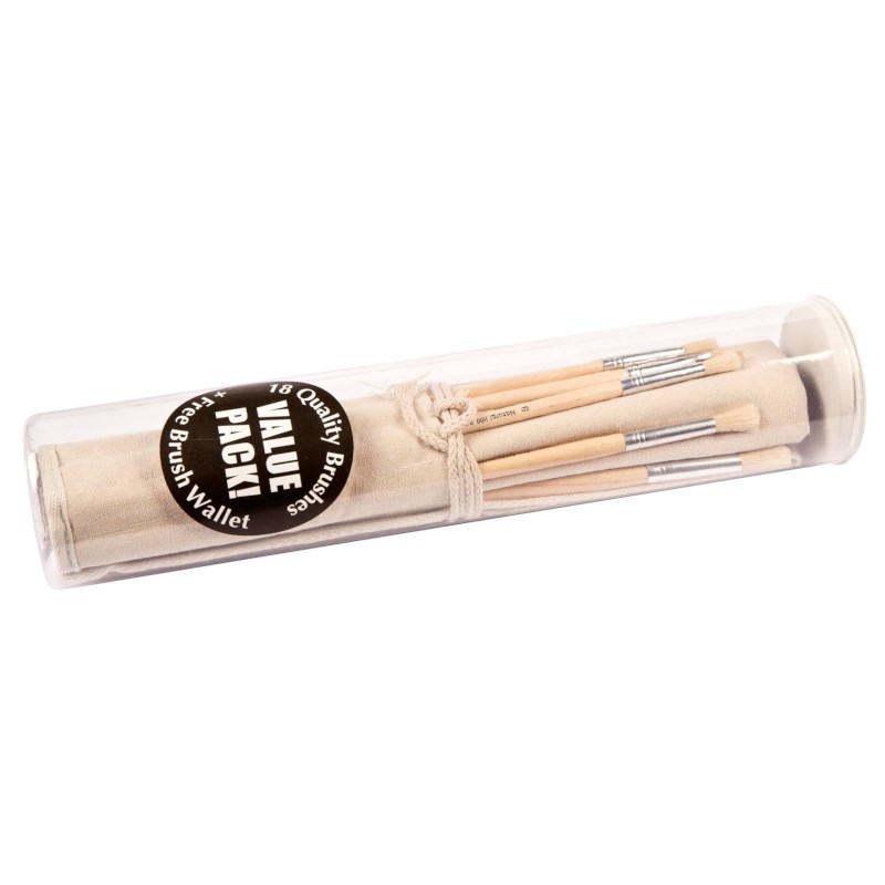 Katoenen penselenmat met daarin 9 ronde en 9 platte penselen. Penseelformaat: No. 1 t/m 8 plus No. 10.