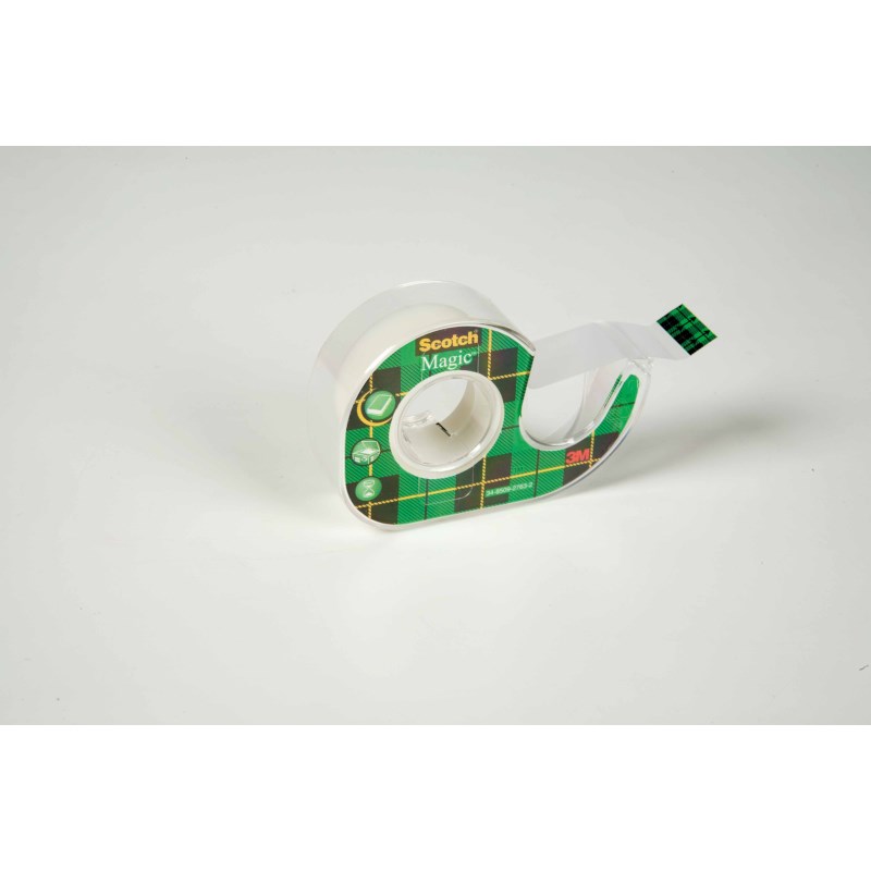 Transparante kunststof plakbandroller inclusief 1 rol Scotch magic tape. Formaat plakband: 19 mm x 7,5 m (b x l).