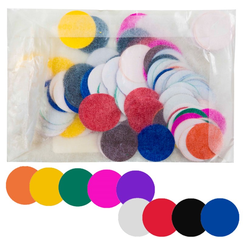 Plakfiguren in de vorm van cirkels (doorsnee 20 mm). Assorti kleuren.
