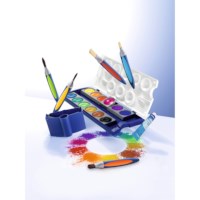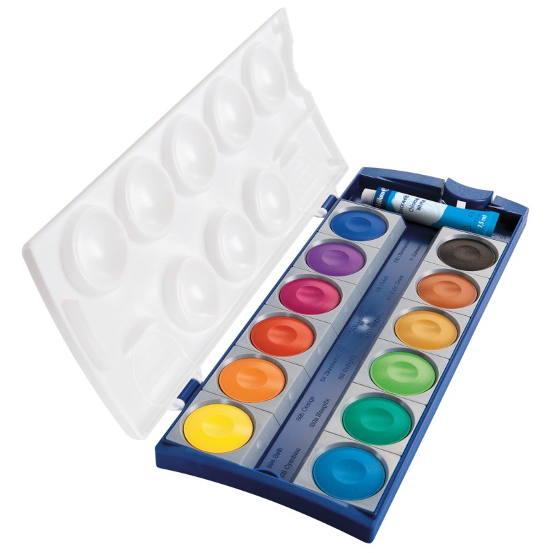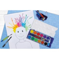 U krijgt geleverd: 1 kunststof doosje met 12 waterverfnapjes, 1 tube witte verf en 1 penseeltje