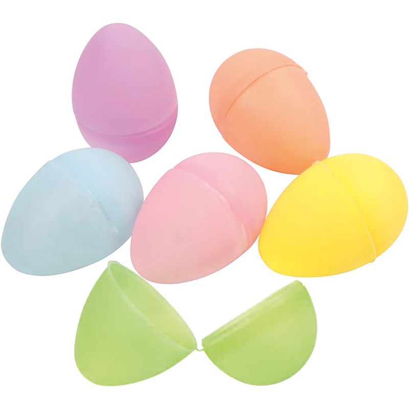 24 glanzende, 2-delig plastic eieren. Pak bevat 6 pastelkleuren, van elk 4 stuks.