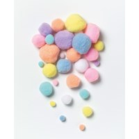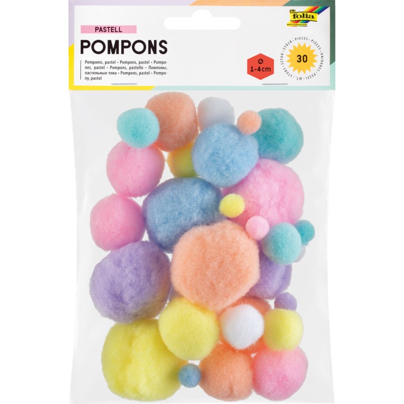Pastelkleuren pompons zakje met 30 pompons in verschillende maten.