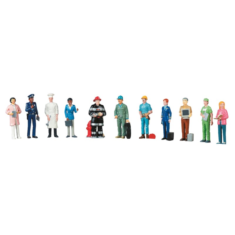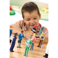 Levensechte toneelstukjes worden mogelijk met deze set figuurtjes. Elf van de meest voorkomende beroepen waaronder politieagent, piloot en dokter. Laat samen met uw kind uw fantasie de vrije loop. De poppetjes zijn ongeveer 13 cm groot.