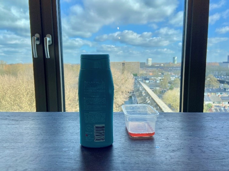Pak het bakje en de shampoo. Vul het bakje met shampoo, let ondertussen goed op hoe de shampoo eruit ziet. Is het slijmerig? Of juist iets vloeibaarder dan slijm? Plaats het bakje vervolgens in de vriezer en laat het hier een uur in staan. Pak het bakje met shampoo na een uur weer uit de vriezer. Kijk nog een keer goed naar hoe de shampoo eruit ziet, is het nu slijmerig of juist vloeibaarder?