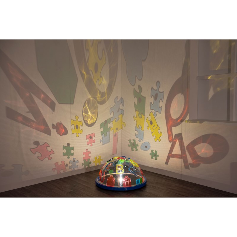 Verander de kamer met 1 druk op de knop in een ruimte waar iedereen zich kan verwonderen. Muren en plafonds veranderen in een canvas vol mooie verhalen of leerzame tekens. Plaats verschillende voorwerpen naast de bol of teken zelfs je eigen figuren op de bol en zie hoe deze geprojecteerd worden op de muur. De bol is gemaakt van veilig polycarbonaat, dit betekent wel dat er geen schurende schoonmaakmiddelen gebuikt moeten worden.