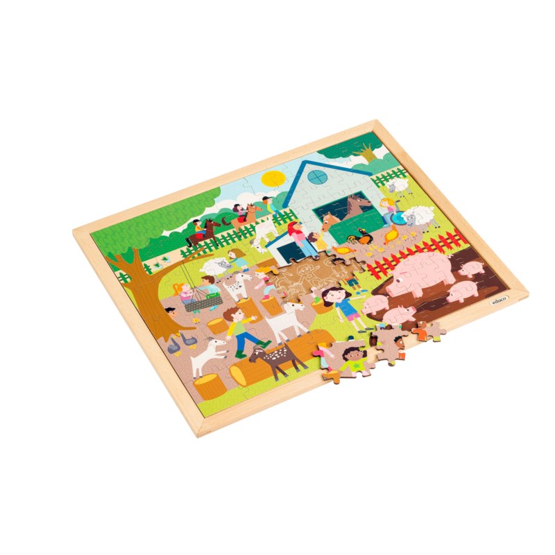 Samen bewegen - op de kinderboerderij is een legpuzzel die laat zien hoe buiten bewegen en natuurbeleving samenkomen. Kinderen voeren geiten, leren over boerderijdieren, verzorgen dieren en rennen over het erf. Ook is er een schommel aan de boom te zien. De puzzel combineert grote en kleine stukken, zodat kinderen op verschillend niveau samen kunnen puzzelen.