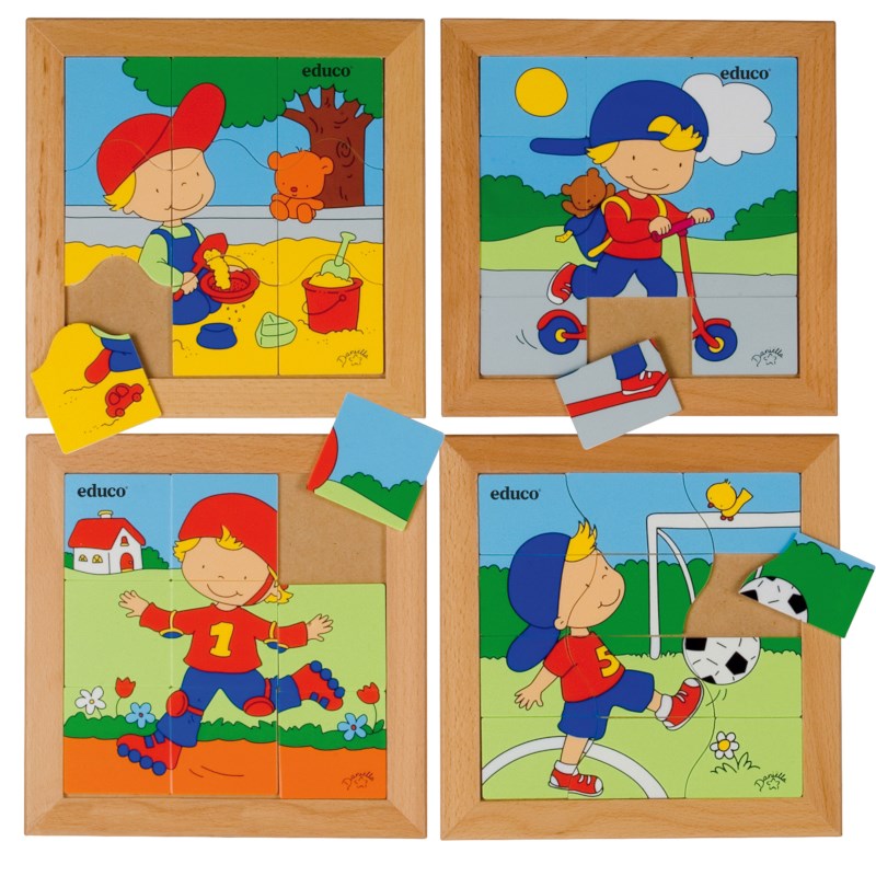Complete set van vier puzzels over de belevenissen van een jongen in verschillende situaties.