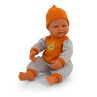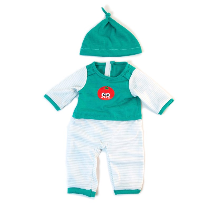 Een zachte pyjama voor poppen van (±) 38 cm lengte. Dit setje bestaat uit romper en muts in sprekende kleuren. Poppenkleding laat kinderen spelenderwijs kennis maken met het aan- en uitkleden. Gelijktijdig trainen ze ook de fijne motoriek.