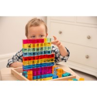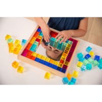 Verwonder je tijdens het spelen met deze heldere kleurrijke regenboogblokken in spiegeltray. De set bestaat uit 100 heldere kubussen en een dienblad met spiegel die het licht nog extra door de blokken reflecteert.