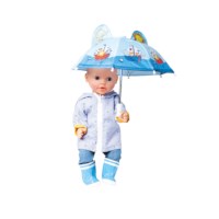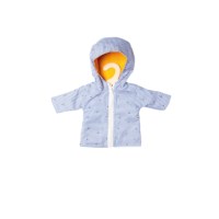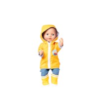 Kleding voor poppen van (±) 40 cm lengte. De kleding bestaat uit een regenjas die ook binnenstebuiten is te dragen. Deze poppenkleding is geschikt voor kinderen vanaf 3 jaar.