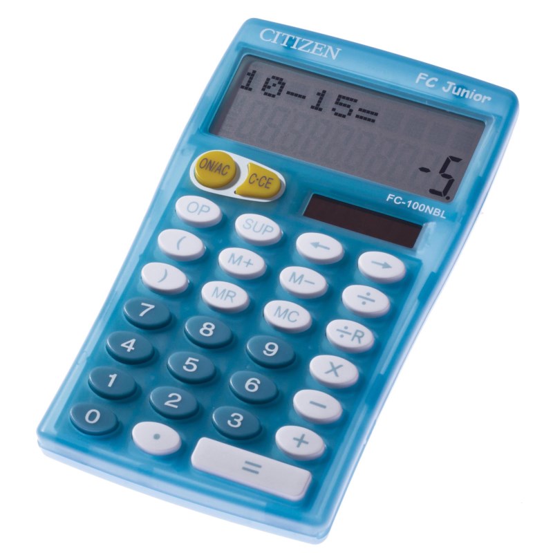 Tweeregelige rekenmachine, welke werkt met de regel: eerst vermenigvuldigen en/of delen en daarna optellen en/of aftrekken.