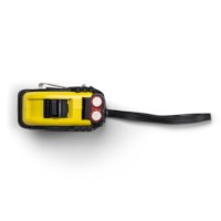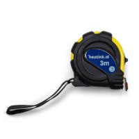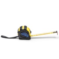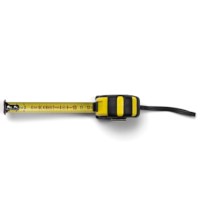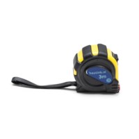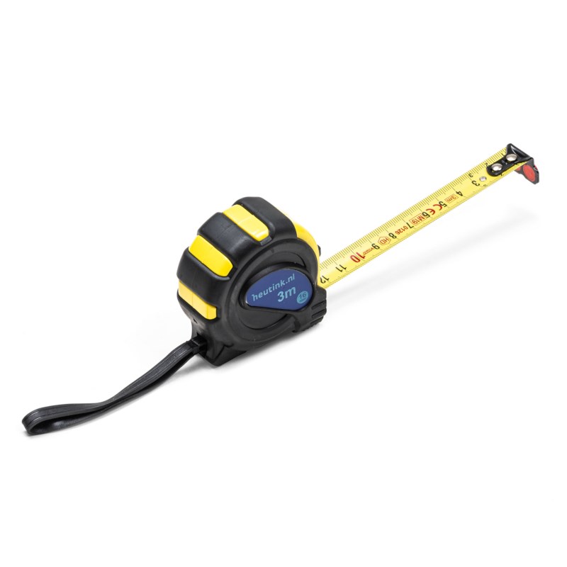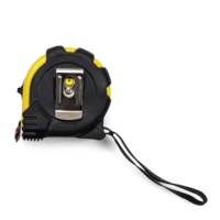 Kunststof kast met automatisch teruglopende gele band. Bandbreedte 13 mm, met millimetermaatverdeling, vastzetknop en broekklem.