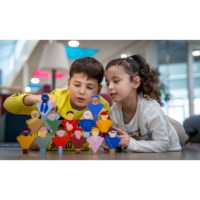 Hoger en hoger. Maak een toren van de stapelfiguren. Plaats de figuren op elkaar en oefen grip en stabiliteit.