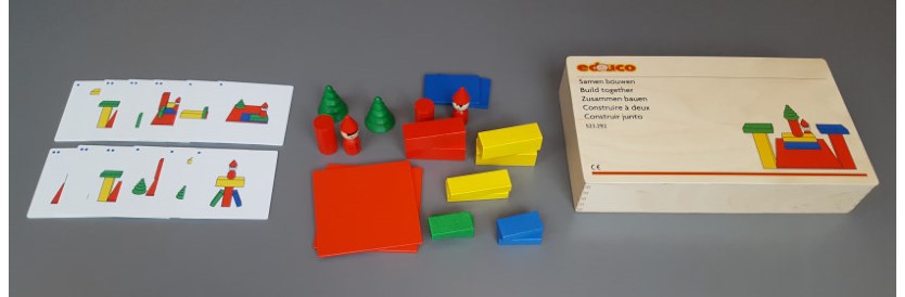 Twee kinderen kunnen dit spel spelen door elk aan een andere kant van tussenschot te gaan zitten. Probeer samen te werken en bouwwerken te bouwen aan de hand van de opdrachtkaarten of maak je eigen ontwerpen. De kinderen geven elkaar mondelinge instructies, zoals: "Zet het rode blokje op het groene." Als ze klaar zijn met bouwen, controleren ze of ze de bouwwerken juist gemaakt hebben. Dit spel stimuleert communicatie, woordenschat, creativiteit en samenwerken.Wat zit er in de doos?