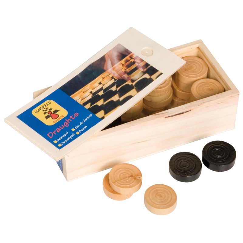 Houten damschijven in kistje t.b.v. het dam-/schaakbord art.nr 058.005. Inhoud: 40 houten damschijven in kistje.