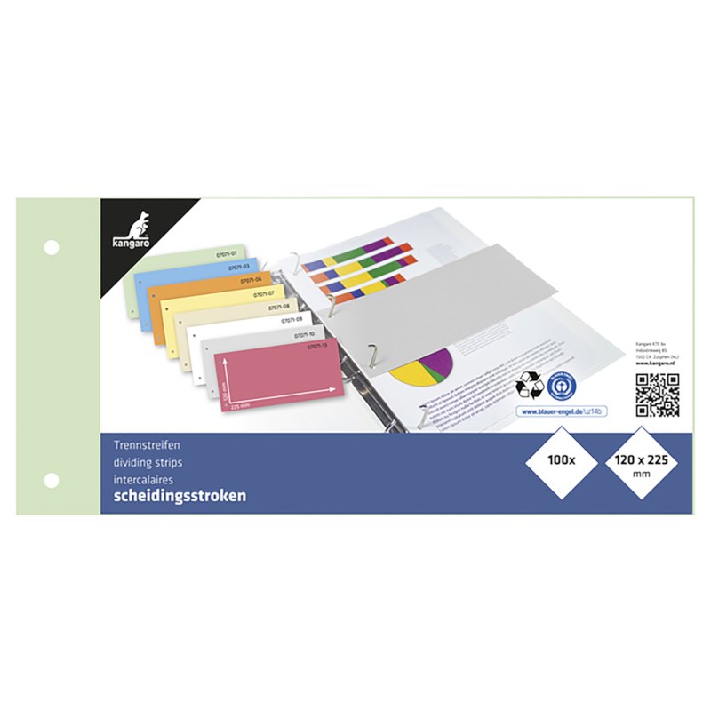 Groene scheidingsstrook voor gebruik in een ordner of 2-rings ringband. Vervaardigd uit 180 grams zuurvrij recycled karton, voorzien van het Blauwe Engel keurmerk en ze zijn verpakt per 100 stuks.