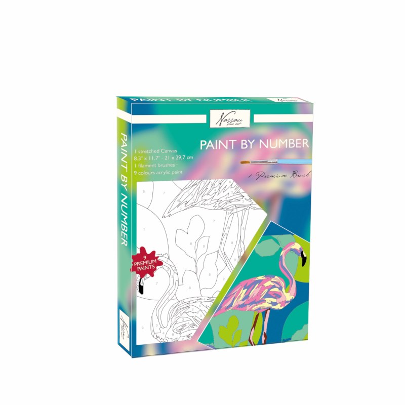 Compleet pakket om een eigen schilderij te maken. Het doek is voorbedrukt met kleurnummers zodat je eenvoudig deze Flamingo kunt schilderen.